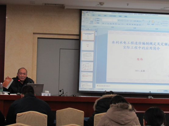 12月19日, 我司特邀水利部四川院概算室主任陳偉授課。陳老師對現行《水利水電建筑工程預算定額》在編制、審核中的應用釋義進行了詳細的分析,并對四川新版《水利水電建筑工程概(估)算編制規定》的調整變化進行了預測。陳老師理論結合實際的授課方式、風趣幽默的授課風格得到大家的一致好評,學員們紛紛表示受益良多。